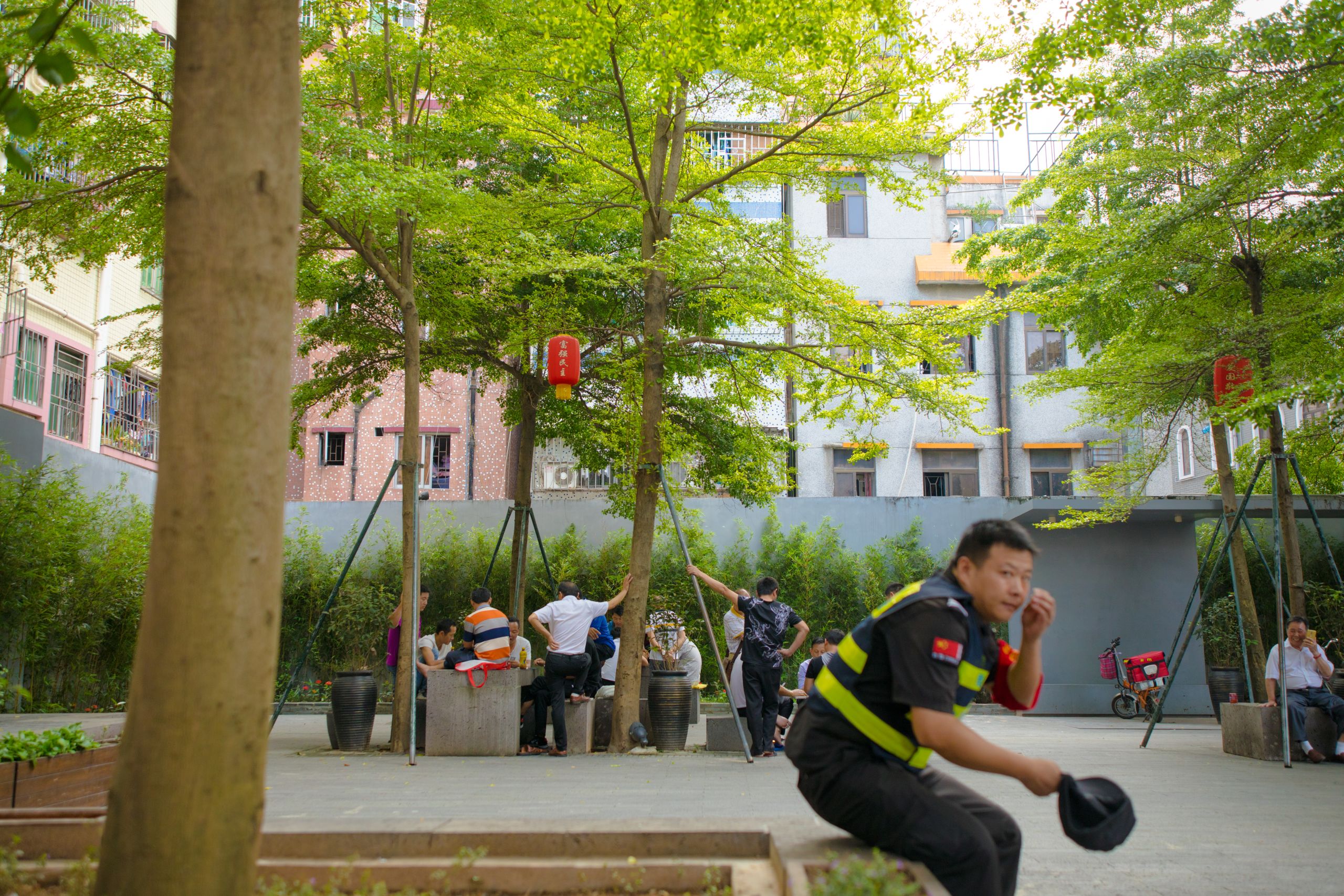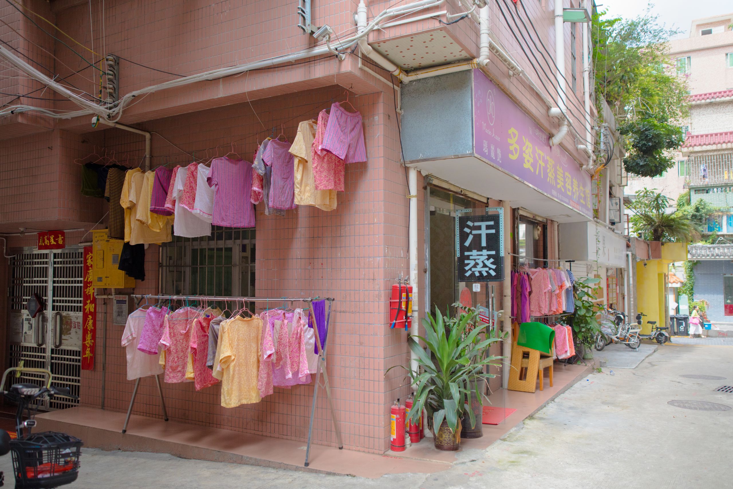 Urban environments have long been linked to increased mental distress for their lack of light, air pollution, crowding, noise, and limitations on autonomy and social activity6,7. As is characteristic for urban villages, Baishizhou’s streets are narrow and marked by closely-built mid-rise apartments - infamously named “handshake buildings” for the fact that one can easily reach out of their window to shake the hands of a neighbour in an adjacent building. To guard from prying eyes in such close proximity, most windows are covered by sun-bleached newspapers. As we weaved through the morning alleyways, the sounds and smells of residents cooking, cleaning, laughing, and shouting wash down from above.