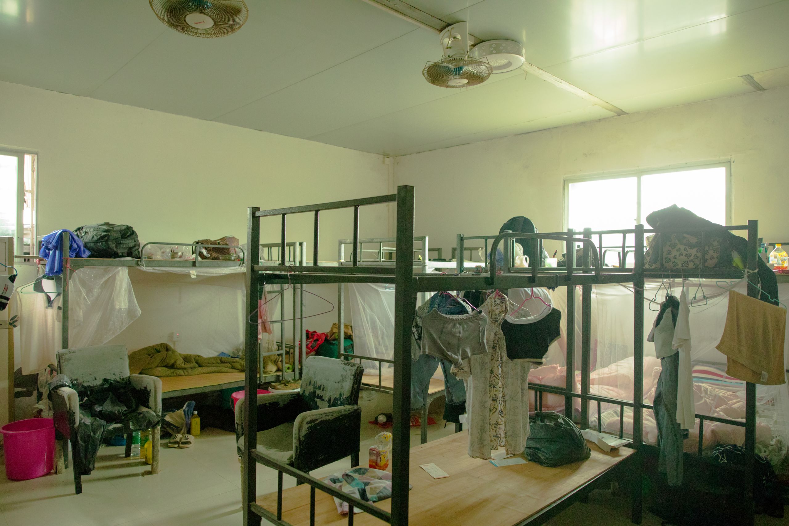 At one end of the common area, a new-looking ping pong table sits. The worksite manager remarks that it is now a mandatory requirement for dormitories to have equipment for recreational activities, though he also mentions that whether people actually utilize them is a different story.